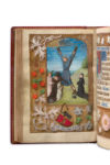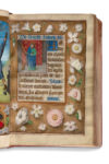 lignes à l’encre carbone, rouge, bleue et dorée ; réglures à l’encre brune ; foliotation moderne au crayon ; textualis formata ; 4 miniatures pleine-page, 28 vignettes avec un encadrements ganto-brugeois richement peint à motifs de fleurs, feuilles, d’insectes et de petits animaux, initiales champies peintes bleues sur fond doré filigranées dorés sur fond rouge, initiales blanches ou dorées parfois ombrées peintes sur trois ou une ligne sur fond doré, rouge ou bleu, rubriques rouges ou bleues (112 x 80 mm) ; étui de conservation. Superbe petite reliure mosaïquée pastiche de la Renaissance, plein maroquin, dos long mosaïqué de noir et citron à motifs d’entrelacs avec le titre au centre, plats ornés de motifs d’entrelacs mosaïqués en noir et citron, double filet sur les coupes, tranches dorées, contreplats ornés d’un maroquin bleu nuit orné d’un décor à la plaque avec un semi fleurdelisé et un encadrement à entrelacs (reliure signée L. Claessens).