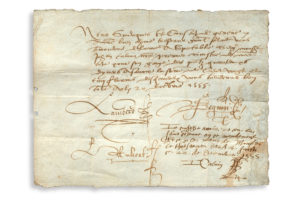 Ordre de paiement des syndics de Genève, en date du 20 décembre 1555 : «Nous Sindiques et Conseil de Geneve A nostre bien aymé tresorier general salut vous commandons delivrer a Spectable Seigr maistre Jehan Calvin nostre premier ministre de nostre cité pour son gaige des presents quartier et dymes asavoir la somme de cent vingt et cinq florins »…. Ont signé Lambert, Beguin et L. Aubert.