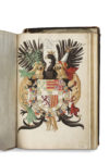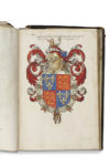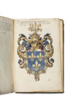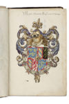 Armorial de la Toison d’or provenant de Viglius van Aÿta (1507-1577), chancelier de la Toison d’Or et l’un des trois conseillers principaux de Philippe II d’Espagne. TEXTE - f.1: Inc. «A la première creation et institution de l’ordre de la thoyson dor en la ville de Bruges. Le xe jour de Janvier mil quatre cens et vingtneuf furent denommez par treshault tres excellent et tres puissant prince Philippe chef et souverain dudit ordre seulement xxiiii chers, combien que la ladite institution en eust deu avoir trente sans ledit chef, desquelz les noms, surnoms et blasons sy après sensuivent. C’est assavoir ». [Suivie des noms des 24 membres fondateurs de la toison d’or]. Le volume se compose de 242 blasons imprimés des chevaliers de l’ordre. Ils sont tous enrichis des armes peintes avec une en-tête manuscrite composée du nom, titre et qualité du chevalier. Seul le blason de Pedro IV Fernandez de Cordoba, 4 e duc de Feria, a été entièrement peint. Le second feuillet s’ouvre sur les armes de Philippe le Bon avec en marge inférieure ajoutée à la main à l’encre noire, sa devise, « Aultre naray ». S’ensuit les 24 membres fondateurs de l’ordre et les 216 autres chevaliers nommés lors des vingt-trois chapitres qui eurent lieu entre 1431 et 1559 (le dernier «Messire Jochem baron de Neuhausen », nommé entre 1559 et 1581). Parmi les plus éminents citons le futur Charles Quint, Henry VIII d’Angleterre et François Ier, reçu lors du dix-huitième chapitre à Bruxelles en 1516. Les armoiries de Gonzalo Fernandez de Cordoba, 3 e duc de Sesa, de Don Carlos d’Autriche, de Luis Enriquez de Cabrera, 2e duc de Medina et de Rioseco, ainsi que celles d’Alfonse d’Aragon, 3 e duc de Cardonna, ont été omises.