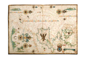 Précieuse et rare carte marine dites Portulan, exécutée à Marseille au milieu du XVIIe siècle, sur parchemin à l’encre brune, réhaussée aux gouaches de couleurs et à l’or liquide, attribuée à un membre de la célèbre famille de cartographes italiens installés à Marseille, François Ollive.