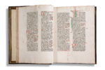 Sans le dernier feuillet blanc. 2 colonnes, 47 lignes (partie I : texte) et 57 lignes (partie II : commentaire), types 2:112 (texte) et 5:92 (commentaires). Maroquin bleu nuit janséniste sur ais larges, dos à nerfs plats, titre doré, triple filet doré sur les coupes, contreplats bordés et ornés d’un encadrement de triple filet doré, tranches dorées (reliure anglaise non signée attribuable à Charles Lewis, ca 1835). Etui bordé moderne.