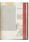 Texte en caractères romains sur deux colonnes de 41 lignes. Papier vergé, filigrane « à la balance » [collation: 110 (table), 2-1210, 1312, 14-1810, 196, 20-2210, 23-258 (feuillet 25/8 bl.), 26-2710 (au feuillet 27/7r fin du texte de Boccace, premier colophon et début de l’index thématique au verso de ce feuillet), 28-2910, 20-3012, 2] (fin de l’index et 31/2v: textes en latin de Dominicus Silvester et de Raphaël Zovenzonius, correcteur de Vindelinus, avec le second colophon)]. Quatre initiales rehaussées à l’encre rouge. Avec de très nombreuses annotations manuscrites, à l’encre rouge ou noire, et plus de 200 dessins à l’encre brune, dans presque toutes les marges intérieures ou extérieures (certaines marges rognées à la reliure avec quelques atteintes à quelques dessins et commentaires). Reliure du XVIIIe siècle. Plein veau fauve marbré, encadrement de filets à froid sur les plats, dos à nerfs apparents soulignés d’une roulette dorée, caissons encadrés d’un double filet et ornés d’un large fleuron floral au centre entouré d’une frise de petites fleurs et de points, et de guirlandes d’angles; pièce de titre en maroquin rouge portant nom d’auteur, titre et date, marque d’appartenance (voir Provenance ci-dessous) en lettres dorées en queue de dos; tranches rouges, gardes de papier peigné.