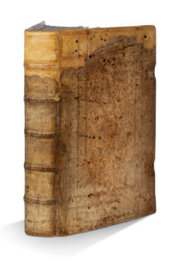 Manquent 2 feuillets blancs in fine. Peau de truie de l’époque sur ais de bois, dos à nerfs, plats ornés à froid d’encadrements de filets et roulette végétale, semis de fleurons dans des croisillons au centre de l’encadrement intérieur. Fermoirs manquants. (Restaurations aux coiffes, dans la partie supérieure du dos et des plats, et aux coupes du second plat, gardes et tranchefiles renouvelées - exemplaire remboîté ; titre et 3 derniers feuillets - dont carte de l’Europe centrale sur page double - fortement restaurés dans les marges, restaurations angulaires ou marginales à quelques autres feuillets).