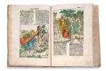 L’histoire de la publication de la Chronique de Nuremberg est sans doute la mieux documentée de tous les incunables : les contrats entre Schedel et ses partenaires Schreyer et Kammermaister, et entre Schedel et les artistes, survivent tous à la Nuremberg Stadtsbibliothek, de même que des manuscrits détaillés des éditions latine et allemande. Les deux éditions étaient prévues simultanément, mais l’édition latine parut cinq mois plus tôt. Exemplaire entièrement en coloris d’époque, agrémenté de plusieurs grandes initiales peintes en bleu et en rouge.