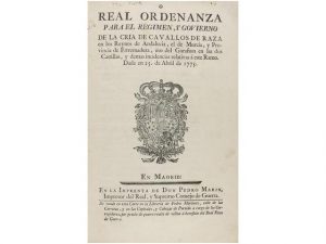 1775. (EQUITACION). REAL ORDENANZA PARA EL REGIMEN, Y GOBIERNO DE LA CRIA DE CAVALLOS DE RAZA EN LOS REYNOS DE ANDALUCIA, EL DE MURCIA, Y PROVINCIA DE ESTREMADURA, USO DEL GARANON EN LAS DOS CASTILLAS, Y DEMAS INCIDENCIAS RELATIVAS A ESTE RAMO. Dada...