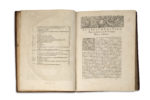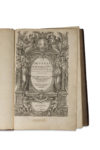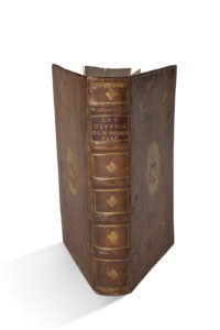 Veau fauve du XVII e siècle, dos à nerfs orné de caissons de double filet doré et de fleurons centraux, pièce de titre de maroquin bordeaux (renouvelée), double encadrement de deux filets dorés sur les plats, fleurons aux angles intérieurs, armes dorées au centre des plats. Boîte-étui moderne en demi-chagrin rouge, dos à nerfs plats, titre doré. Ex-libris « Bouhier » à l’encre au bas du titre, partiellement gratté. (Charnières restaurées et fragiles, quelques petites auréoles sur les plats ; taches rousses à quelques cahiers, quelques soulignures à l’encre.)