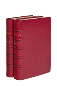 Reliure de plein maroquin cerise, dos à 5 nerfs, auteur et tomaison dorés, tranches dorées et marbrées, contreplats doublés de maroquin rouge, filet à froid en encadrement, gardes de papier marbré peigné (Quelques épidermures et mais fort bel exemplaire).