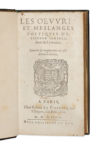 Chagrin bleu second Empire, dos à nerfs orné, encadrement de filets dorés sur les plats, fleurons d’angle, filets sur les coupes et contreplats, tranches dorées, chemise en demi-chagrin bleu et étui bordé postérieurs. (Angle supérieur droit du titre gratté avec atteinte aux deux dernières lettres du mot « Œuvres », date partiellement grattée, d’où l’erreur dans la date au dos de la chemise, 1573 au lieu de 1583, petite déchirure sans manque au feuillet 106.)