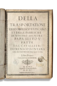 FONTANA (Domenico) (1543-1607) — Della Trasportatione dell’ obelisco Vaticano et delle fabriche di Nostro Signore Papa Sisto V. Rome, Domenico Basa, 1590 — In-folio (408 x 270 mm), portrait-frontispice replié, titre illustré gravé, 108 ff....