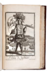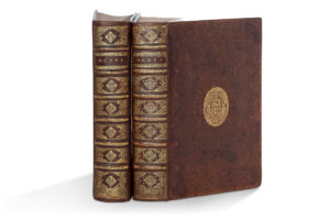 Veau brun moucheté de l’époque, dos à nerfs orné, titré doré, armes au centre des plats, coupes décorées. Etuis bordés modernes. (Habiles restaurations aux coiffes et coins ; une dizaine de déchirures sans manques restau - rées, 3 estampes restaurées avec atteinte à la composition.)