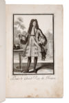 Ces deux volumes offrent une spectaculaire revue de personnages, costumes et métiers du siècle de Louis XIV. Les « portraits en mode » y sont particulièrement bien représentés, gravés par plusieurs membres de la dynastie Bonnart – Henri II, le plus célèbre, ses frères Nicolas Ier et Robert -, représentant les célébrités de l’époque sous l’aspect de jeunes mannequins attrayants, à commencer par le roi, Madame de Maintenon, la famille royale, la Cour… D’Henri Bonnart figurent également plusieurs estampes de la série de ses allégories mises en mode. Les autres gravures de mode contenues dans ces volumes sont dues à Jean Dieu de Saint-Jean, aujourd’hui considéré comme l’inventeur du genre, et à ses suiveurs parisiens Claude-Au - guste Berey, Nicolas Arnoult, ou encore Antoine Trouvain. On y trouve enfin un très important ensemble (75 planches) de « costumes gro - tesques » de Nicolas de Larmessin, fascinante suite de portraits allégoriques composés à partir des outils et produits de leur métier.