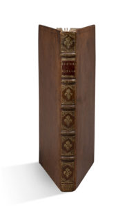 Veau fauve de l’époque, dos à nerfs fleurdelisé, pièce de titre de maroquin bordeaux, encadre - ment d’un triple filet à froid sur les plats, coupes décorées, chemise en demi-basane brune (insolée) et étui bordé postérieurs. (Quelques discrètes restaurations à la reliure, charnières un peu fendues).