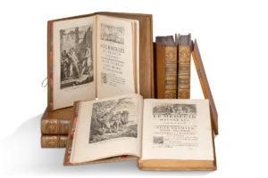 (6)-446 pp. et 6 pl. ; (6)-442 pp. et 6 pl. (manquent les 8 ff. des cahiers N et O ; R1 supplémentaire - pp. 129-130 du vol. I) ; (6)-420 pp. et 6 pl. (+ R1 et R2 supplémentaires in fine, différents des R1 et R2 précédents par l’en-tête et la lettrine gravés) ; (6)-618 pp. et 5 pl. ; (6)-554 pp. et 6 pl.