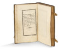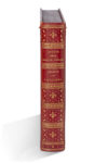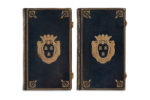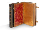 Maroquin bleu nuit de l’époque, dos lisse orné, encadrement d’un triple filet doré sur les plats, fleurons aux angles, armes dorées de la marquise de Pompadour au centre, coupes et bordures intérieures décorées, contreplats doublés de maroquin rouge doré aux petits fers, gardes de papier doré, tranches dorées, fermoirs dorés (reliure de Derome). Coffret moderne en maroquin rouge orné, imitant un volume in-4 oblong (208 x 250 mm).