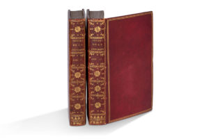 Maroquin rouge de l’époque, dos lisse fleuronné, titre doré, encadrement d’un triple filet doré sur des plats, filet sur les coupes et dentelle intérieure, tranches dorées sur marbrure. (Quelques feuillets roux.)