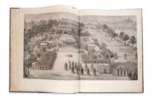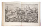 Spectaculaire suite complète, en premier tirage, des 16 estampes commandées à la France par l’empereur de Chine pour célébrer ses victoires militaires. À la suite de ses conquêtes en Haute-Asie menées de 1755 à 1759, l’empereur de Chine Qianlong voulut immortaliser ses faits d’armes en décorant le palais Zi Guang Ge de Pékin de 16 peintures illustrant ses propres poèmes relatant la campagne. Il confia le soin à quatre missionnaires établis à Pékin, les jésuites Giuseppe Castiglione, Ignatus Sichelbarth, Jean-Denis Attiret et Jean Damascène, d’en réaliser les esquisses préparatoires.