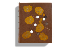 feuillets de papier vélin fort, le tout en un fort volume in-fol., reliure parlante maroquin havane à grand décor mosaïqué et doré sur les plats et le dos avec des pièces de maroquin jaune, blanc, brun représentant des abeilles et des alvéoles de ruche ; doublures de maroquin citron avec croisillon de filets à froid, gardes de moire vert bronze, doubles gardes, tranches dorées, étui (Fryns).