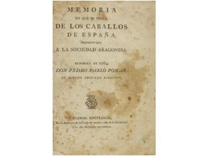 1789. (EQUITACION). POMAR, PEDRO PABLO: MEMORIA EN QUE SE TRATA DE LOS CABALLOS DE ESPANA. Madrid: en la Imprenta de la Viuda de Ibarra, 1789. 4°. 2 h. (incluídas la portada y la hoja que sigue, sucias), XII + 135 p. (con manchas en el margen...