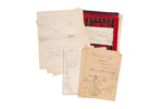 A. Dossier de notes, plans, ébauches, listes des personnages, croquis et tableaux. Un bloc étiqueté « Gueule de Pierre Parerga 1933-1934 » comprenant 25 ff in-4 détachés du bloc ligné (dont 3 écrits et raturés au verso), 10 ff. épars et 9 ff. arrachés à un carnetin-12. On relève de nombreux plans, des notes préparatoires, des faux débuts, des schémas d’organisation du roman, certains sous forme de tableaux, un plan dessiné de la Ville Natale (daté 27 septembre 1933), une liste de noms de villages de Cornouailles datée du 28 septembre avec leur transformation en noms de personnages (Kuggar devenant Kougard, Poldowrian Pol Dovrian…), un tableau des signes du Zodiaque (avec leur symbole à l’encre rouge, le nom grec et romain des divinités qui s’y rattachent, et les organes du corps concernés), des projets de titres (Un Homme devient une Pierre, Totem et Tabou, Un père avait 3 fils, Saint-Glinglin, Les Origines du Totémisme, etc.), un projet de « Note liminaire et même, peut-on dire, préliminaire », des listes de personnages (une avec les « noms modifiés le 28.4.34 »), un « État du roman le 23 sept. », etc.