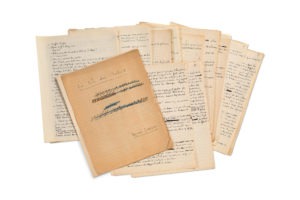 B. Manuscrit autographe avec très abondantes corrections, remaniements, passages biffés, laissé à l’état d’ébauche par endroits, non titré, comprenant 249 feuillets in-4 (27 x 21 cm la plupart), à l’encre noire sur papier à carreaux ou simplement ligné, la plupart écrits au seul recto, avec 11 feuillets dactylographiés portant des corrections autographes, et une dizaine de petits papiers avec quelques notes. Certains feuillets sont chiffrés
