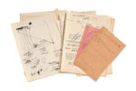 A. Notes sur des papiers divers, de formats et de types très variés (dont des prospectus, feuillets de carnet de poche, et une enveloppe portant le nom et l’adresse de Queneau de la main d’Henry Miller), formant 100 feuillets, la plupart écrits au seul recto, avec quelques petits dessins (têtes et personnages).