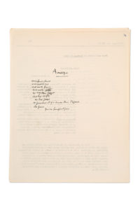 3 poèmes manuscrits et le poème dactylographié ne figurent pas dans le recueil publié : ORTF (p. 61), Baptêmes (p. 72), et le très court poème composé d'un seul long vers : Une expression toute faite (p. 166). Ces trois poèmes sont accompagnés ici de leurs épreuves imprimées et corrigées, ainsi que de celle du poème Pour les cinquante ans de Mario Prassinos (pp. 92-93) en tapuscrit avec titre autographe.