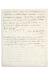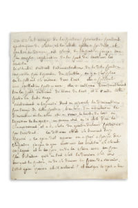 Lettre de prison à ses oculistes, alors qu’il souffre d’un début de cécité. [Sade a été soigné par les oculistes Henri et Guillaume GRANDJEAN et Antoine DEMOURS fils.] « On a fait usage de la poudre prescrite pendant quatre jours de suite, et les effets quelle a produits et que l’on va décrire, ont forcé de suspendre jusqu’a une plus ample explication de la part de Messieurs les oculistes. La situation rendant l’administration de la dite poudre impossible par l’operation du souffle, on y a suppleé en la jettant soi meme dans l’œil, elle a produit une irrittation prodigieuse, elle a enflamé considerablement tous les petits vaisseaux du blanc de l’œil, et a rendu cette partie la toute rouge. Relativement a l’opacité dont on esperoit la diminution par l’usage de cette poudre, bien loin d’en accellerer la diminution ou la fin elle a remis, le louche de l’œil, ou l’epaisseur de la gaze, au meme etat ou il etoit dans les commencements, et a la suite des grandes douleurs produites par l’accident ». Il a suspendu le traitement et prie «Messieurs les oculistes » de revenir le voir, ou au moin de répondre en attendant à ses questions : « L’effet qu’on eprouve est-il naturel ? Et malgré ce qu’il a de facheux doit-on esperer du soulagement en continuant ? Ou faut-il changer de remede ». En attendant, il a arrêté le traitement « a l’exeption des injections de colire a raison de deux par jour »…