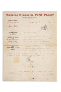 SAINT-EXUPÉRY Antoine de (1900-1944) — L.A.S. « Saintex », [Casablanca, vers 1925-1927 ?], à ses amis pilotes ; 2 pages d’un feuillet in-4 (27,5 x 21,3 cm) à en-tête de la «Taverne Brasserie Petit Poucet à Casablanca, encre noire...