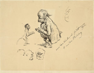 Le dessin représente un couple de singes en conversation. Un gros singe, vêtu d’une veste et accroupi, a la tête de Verlaine. En face de lui, un petit singe, nu, se tient debout. Au-dessous, trois études de têtes simiesques, reprenant les traits de Verlaine. Sur la droite, un autre visage, de profil. Cette caractéristique de l’aspect physique de Verlaine a notamment été soulignée par son ami Edmond Lepelletier dans Paul Verlaine, sa vie son œuvre (1907) : «Vieilli, sa physionomie disgracieuse et bizarre, asymétrique, avec son crâne bossué et son nez camard, paraissait encore supportable. On la voyait briller de l’éclat de l’esprit, et auréolée du rayonnement du talent. On s’accoutumait à son masque faunesque, quand il riait, à son aspect sinistre, quand il gardait le sérieux [...]. Mais, dans sa jeunesse, il était d’une laideur grotesque ; il ressemblait, non pas au type mongoloïde, comme on l’a dit, mais à un singe, et son originalité babouinesque ne pouvait inspirer à une femme rencontrée qu’un sentiment d’éloignement, de répugnance, peut-être d’effroi et de dégoût ».