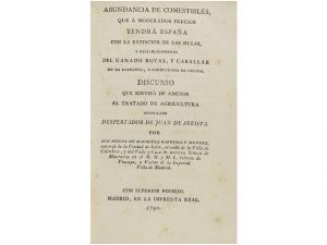Tratado de Agricultura intitulado Despertador de Juan de Arrieta. Madrid: en la Imprenta Real, 1790. 8° menor. XVI + 183 p. Enc. en media piel. Tejuelo.