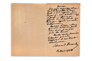 BRANLY Édouard (1844-1940) Physicien — L.A.S. « Édouard Branly », 14 août 1918, à Gaston Tournier, secrétaire général des Archives ; 1 page in-12, adresse (carte-lettre).