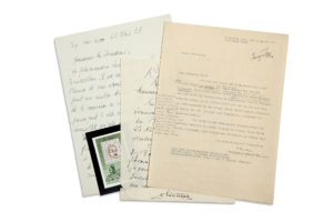 – M. GOTTSCHALK, Bruxelles 7 mai 1934, transmettant la lettre d’Einstein (1 p. in-4). Plus un timbre allemand (R.D.A.) édité à l’occasion du centenaire de la naissance d’Einstein, en 1979.