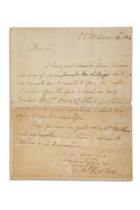 Une de ses dernières lettres (Malthus mourra d’une crise cardiaque le 29 décembre). [John LINNELL (1792-1882) peintre et graveur, est l’auteur d’un portrait de Malthus, alors professeur d’économie politique au Collège de la Compagnie anglaise des Indes orientales (East India Company) à Haileybury, dans le Hertfordshire.] Malthus vient de recevoir de Colman (l’écrivain George Colman ?, 1762-1836) la somme de 11 pounds 10 shillings avec instruction de la transmettre à Linnell (« to remit to you by draft »).
