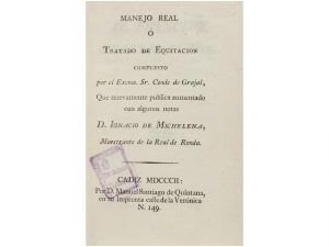 1802. (EQUITACION). GRAJAL, CONDE DE: MANEJO REAL, O TRATADO DE EQUITACION. Nuevamente publica aumentado con algunas notas D. Ignacio de Michelena, Maestrante de la Real de Ronda. Cadiz: por D. Manuel de Qujintana, en su imprenta.., 1802. 8° menor....