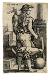 Bulino. mm 89x57. Bartsch, 126. Hollstein, 128. Con il monogramma sul poliedro in basso a sinistra, il numero "6" all'angolo inferiore destro e il titolo in alto verso sinistra. Sesta tavola dalla serie Le sette arti liberali. Buona prova su carta vergellata lievemente spessa.