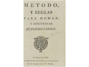 1807. (EQUITACION). METODO, Y REGLAS PARA DOMAR Y DOCTRINAR EL POTRO CARRIL. Hamburgo: En la Imprenta de F.H. Nestler, 1807. 8°. 30 p. (incluída la portada, con el Escudo Real grabado). Enc. en moderno cartonè. Cortes tintatos.