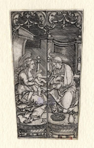 Bulino su lastra trapezoidale. mm 75x35/42. Hollstein, 58. Da Dirk Jacobsz. Vellert. Bellissima impressione brillante e nitida su carta vergellata molto sottile. Al verso marchio di collezione con lettere "A.B." a inchiostro violetto non identificato (Lugt, 3049).