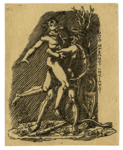 Acquaforte. mm 218x171. Bartsch, XIII, 13. Copia del XVIII secolo dalla xilografia che Giovanni Antonio da Brescia trasse da originale del Mantegna. Esemplare inciso grossolanamente all'acquforte alla maniera di una xilografia. Il monogramma "JS", affiancato alla data "42", non consente di identificare il copista. Foglio impresso su carta sottile tipo pergamena color sabbia e priva naturalmente di vergelle. Si veda altro esemplare nelle raccolte del British Museum (inv. 1872,1012.3465).