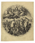 Bulino su lastra rotonda. Ø mm 262. Foglio: mm 305/307x265/270. New Hollstein (Goltzius), 342 e 345. Con in basso il nome dello Stradano inventore e l'excudit di Philips Galle. Tavola 1 e 4 da Le ultime quattro cose, serie databile al 1578 circa da invenzioni di Jan van der Straet ed edita per la prima volta ad Anversa da Philips Galle. Bellissime impressioni, nel I stato di 2 la tavola 1, prima della comparsa del nome dell'incisore "HG sculp" in basso a sinistra, dell'indirizzo di Visscher e della numerazione; nel II stato di 3 la tavola 4, dopo la sostituzione con turbanti del cappello cardinalizio e della tiara nelle due figure in basso al centro, e prima della comparsa del nome dell'incisore e della numerazione. Carta vergellata sottile con filigrana "lettera B entro scudo coronato" (Briquet, 8070 - Amsterdam, 1574) presente su entrambi i fogli.
