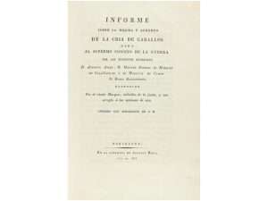 1818. (HIPICA). AMAR, ANTONIO; FREYRE, MANUEL; CASA-CAGIGAL, MARQUES DE; BALLESTEROS, DIEGO: INFORME SOBRE LA MEJORA Y AUMENTO DE LA CRIA DE CABALLOS DADO AL SUPREMO CONSEJO DE LA GUERRA... Barcelona: Imp. de Agustin Roca, 1818. 4°. mayor. Portada...
