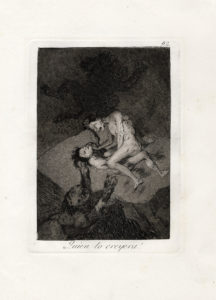 Acquaforte, acquatinta brunita. mm 208x150. Foglio: mm 313x237 . Harris, 97. Con il titolo al margine inferiore e il numero in alto a destra. Sessantaduesima tavola da Los Caprichos, serie in 80 tavole pubblicata per la prima volta dallo stesso Goya nel 1799, ed edita in complessive 12 edizioni. Bellissima prova nel III stato su 3, comune a tutte le impressioni editoriali, impressa in bruno scuro su carta bianca spessa non vergellata. Esemplare dalla IV edizione dopo la bisellatura della lastra, stampata dalla Calcografia per la Real Academia nel 1878 circa.