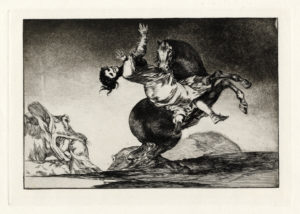 Acquaforte, acquatinta brunita e puntasecca. mm 245x350. Foglio: mm 308x420. Harris, 257. Decima tavola da Los proverbios, serie in 18 incisioni alla quale probabilmente Goya iniziò a lavorare poco dopo la pubblicazione de La tauromachia nel 1816, le tavole furono ultimate prima della partenza per Bordeaux nel 1824 e la raccolta pubblicata per la prima volta solo nel 1864. Ottima prova stampata in seppia scuro e nero su carta pesante non vergellata priva di filigrana, presenta la bisellatura e traccia del numero "10" oscurato in alto a destra, come segnalato da Harris per alcune impressioni di questa edizione, caratteristiche comuni a tutte le edizioni successive la prima. Esemplare nel III stato di 3, comune a tutte le impressioni editoriali, dalla V edizione di 9, realizzata dalla Calcografia per la Real Academia nel 1904.