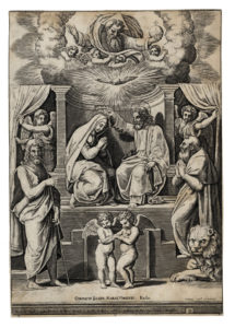 Bulino. mm 360x253. Bartsch, XV, 9. Raphael invenit (altri arazzi), Ib. Il gruppo di Cristo che incorona la Vergine e il particolare centrale degli angeli derivano da disegni di Raffaello. La stampa fu utilizzata come modello per l'arazzo con le armi di Paolo III offerto nel 1537 al Papa dal cardinale di Liegi. Buona prova nel IV stato di 6 con l'indirizzo di Giovan Giacomo De Rossi. Carta vergellata spessa apparentemente priva di filigrana.