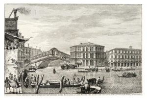 Michele Marieschi, Forum olitorium e regione prospectum, cum proximis publicis Magistratibus, et ponte Rivoalti: citra pontem aedes mercatoria gentis Gremanicae ad laevam (Il Ponte di Rialto con il Palazzo dei Camerlenghi). 1740-1741 [Venezia: 1741].