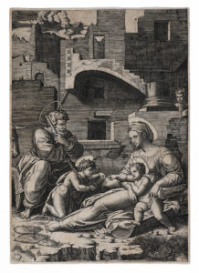 Bulino. mm 388x273. Bartsch,XIV,57. Shoemaker, 59. Raphael invenit (Madonne), XXXVIII, p. 207, 1. Soggetto in relazione a disegni eseguiti da Raffaello tra il 1518 e il 1519 sul tema della Sacra Famiglia, e forse uno degli ultimi lavori di Marcantonio sotto la guida del maestro. Ottima impressione riccamente inchiostrata nell'unico stato censito, su carta vergellata con filigrana "ancora con anello in cerchio singolo" (Briquet, 460 / Venezia, 1472/1490). In basso al verso a penna e inchiostro bruno nota di possesso di Johann Sigmund Bermann (Oesdorf, 1794-Vienna, 1846) mercante di stampe a Vienna (Lugt, 235).