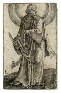 Bulino. mm 118x74. Bartsch, 94. New Hollstein, 94. Con la lettera "L" iniziale dell'autore in basso a sinistra. Nona tavola dalla serie di 14 Cristo, Paolo e i dodici apostoli. Bellissima prova, stampata nitidamente e con tonalità, su carta vergellata priva di filigrana.