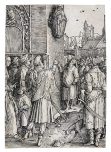 Xilografia. mm 393x273. Bartsch,VII, 16. New Hollstein, 180 (b/c). Dalla serie Il grande potere delle donne. Bellissima impressione di questa rara xilografia nella variante b su c censita da New Hollstein, dopo la scomparsa degli uccelli nel cielo tra le due piccole torri, ma prima di spacchi in verticale e di più accentuati segni di usura. Carta vergellata sottile apparentemente priva di filigrana. Al verso in basso marchio di collezione con "lettere GC contrapposte entro cerchio" (non su Lugt).