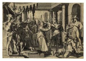 Bulino. mm 267x380. Hollstein, 51. Sulla lastra in basso a sinistra "JWtewael Inuetor", "GSwaneb: scul:" e "CVSichem excudit.". Da un soggetto di Joachim Wtewael. Seconda tavola da Thronus Iustitiae, serie in tredici fogli eseguita tra il 1605 e il 1606