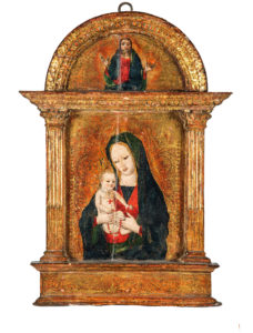 Scuola italiana del XVI secolo, Madonna col Bambino con collanina di corallo entro edicola / Cristo pantocrator nella lunetta sovrastante.