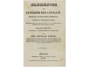 1843. (EQUITACION). CASAS, NICOLAS: ELEMENTOS DEL ESTERIOR DEL CABALLO, DERECHO VETERINARIO COMERCIAL Y MEDICINA VETERINARIA LEGAL. Mandados seguir de orden de S.M. en la ensenanza de los alumnos que estudian dicha materia. Segunda edición...